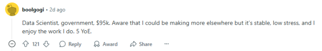,政府,工作经验5年,年薪$9.5万。(注:我可以在其他行业拿到更高的薪水,但政府工作胜在稳定,压力小。)
