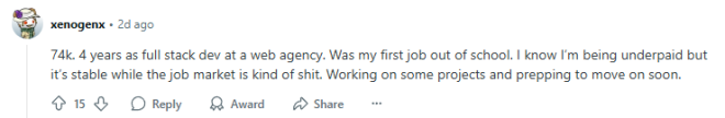 ,网络代理公司,工作经验4年,年薪$7.4万。(注:这是我离开学校的第一份工作,我知道我的薪水低于市场,但是它很稳定。现在的工作市场很差劲。我手里还有一些项目,正准备离开。)