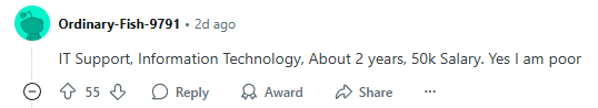 ,信息技术,工作经验2年,年薪$5万。(注:是的,我很穷。)