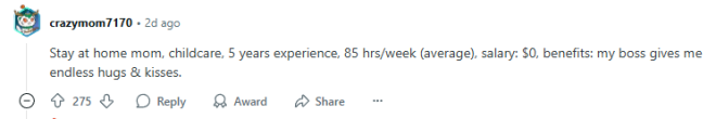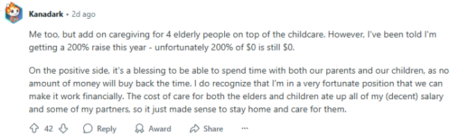 “我也是,不过除了照顾孩子之外,还要照顾4位老人。不过,听说我今年的工资要涨200%——可惜的是,$0的200%还是$0.