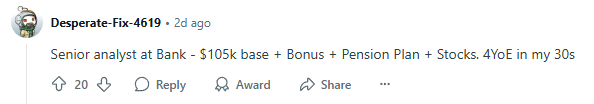 ,银行,工作经验4年,底薪$10.5万,有奖金,有养老金计划,有股票。
