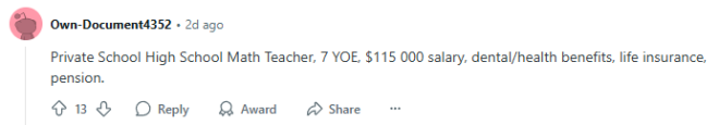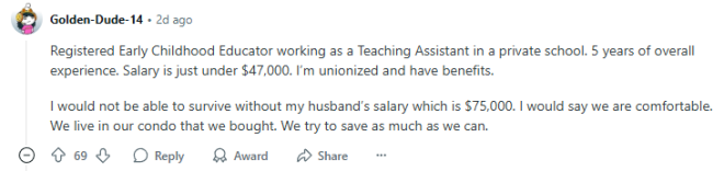 ,在一家私校当助教,工作经验5年,薪水不到$4.7万。(注:我有工会和福利。如果没有我丈夫$7.5万的年薪,我根本活不下去。我们的生活很舒适。我们住在自己买的公寓里。我们在努力存钱。)