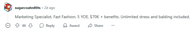 ,时尚快销,工作经验5年,年薪$7万,外加福利。(注:无尽的压力,头已秃。)