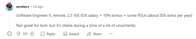 ,远程工作,工作经验2.5年,年薪$8.2万,奖金10%,一些公司股票(每年约$5.000)。(注:对于技术来说,这薪水不算高,但是在充满不确定的当下,这还算稳定。)