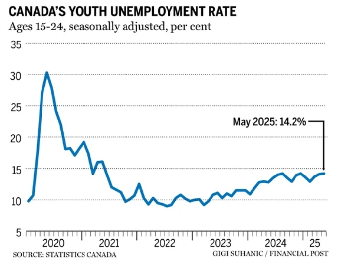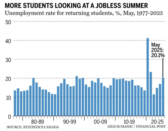 加拿大统计局数据显示,2024年5月,全国15至24岁青年的失业率高达14.2%,几乎是全国总体失业率(7%)的两倍。对于秋季返校的全日制学生而言,这一比例更是飙升至20.1%,创下自2009年以来同期最高纪录。