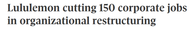 温哥华运动服饰公司Lululemon Athletica Inc. 昨天(周三)也官宣了裁员决定:作为组织结构调整的一部分,该公司将裁减约150个公司职位。