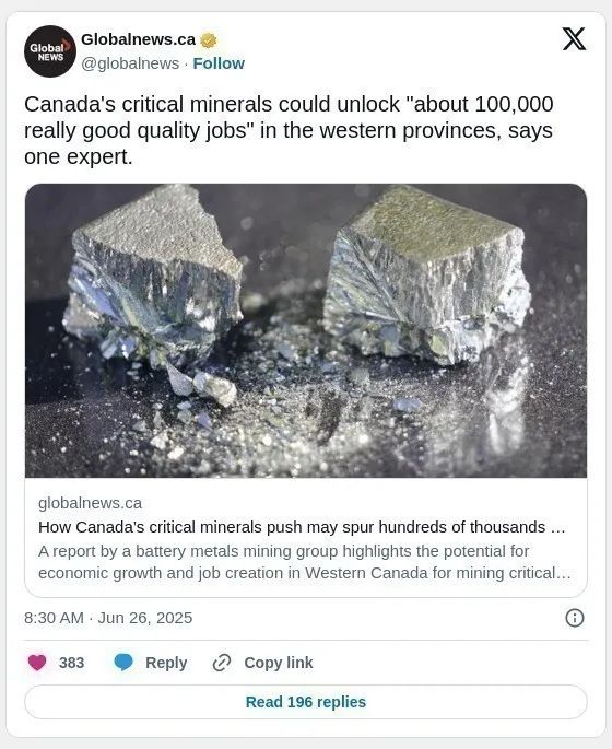 随着全球对电动汽车和新能源的需求持续上升,加拿大的矿产资源将成为未来发展的重要引擎。在全力推动关键矿产资源开发的同时,加拿大也在努力通过基础设施建设、就业创造和绿色能源等措施,确保国内经济能在全球经济格局中占据一席之地。