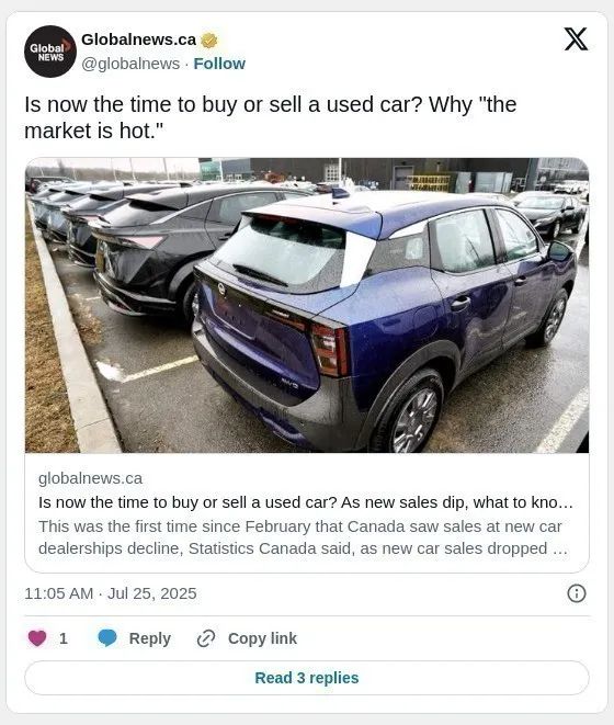 随着美国前总统川普实施的关税政策持续影响北美经济,加拿大新车销量大幅下滑,令消费者纷纷将目光转向二手车市场。眼下,对于许多加拿大人来说,“买还是卖”成了关键问题。