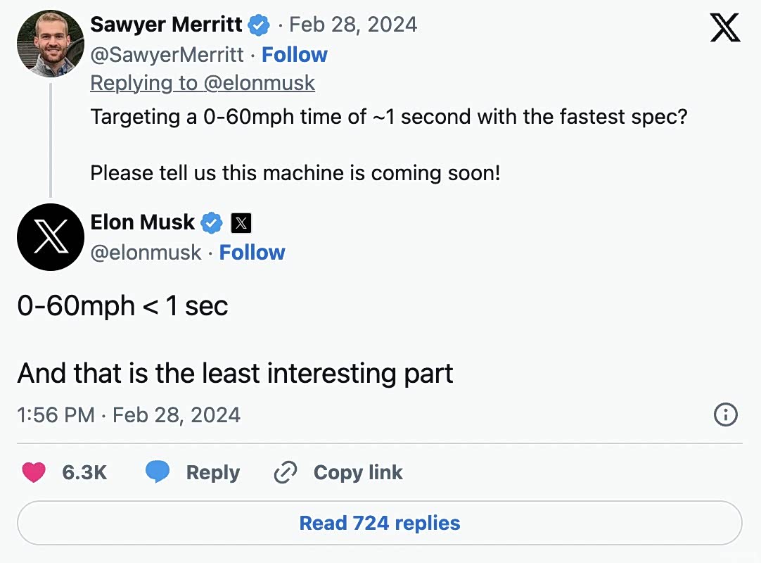 上周我们向马斯克展示了这台车的独特技能,他显得很兴奋。”随后,马斯克在社交媒体上表示,“年底前将带来史诗级的作品。”虽然马斯克并未说明是什么,但显然是Moravy口中描述的全新Roadster。