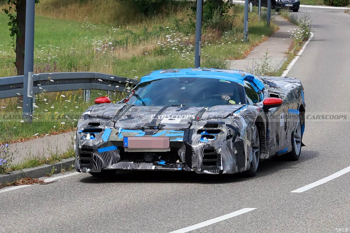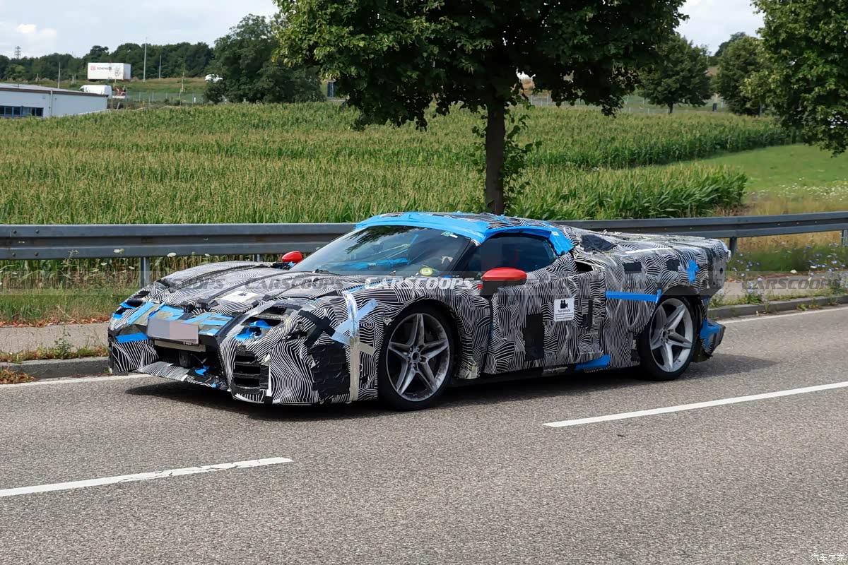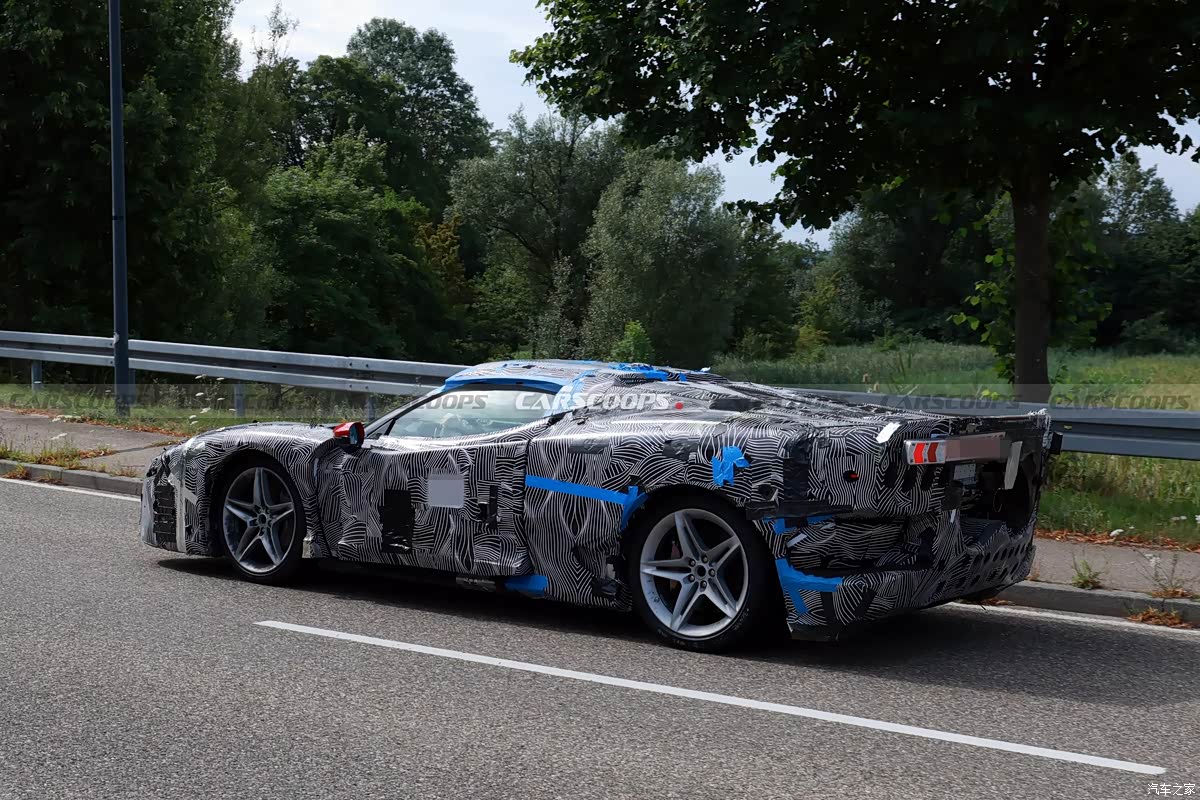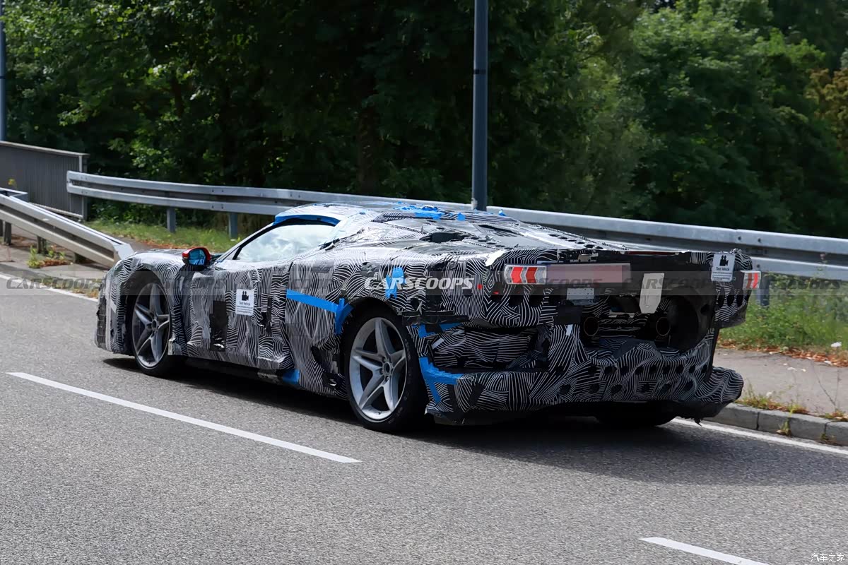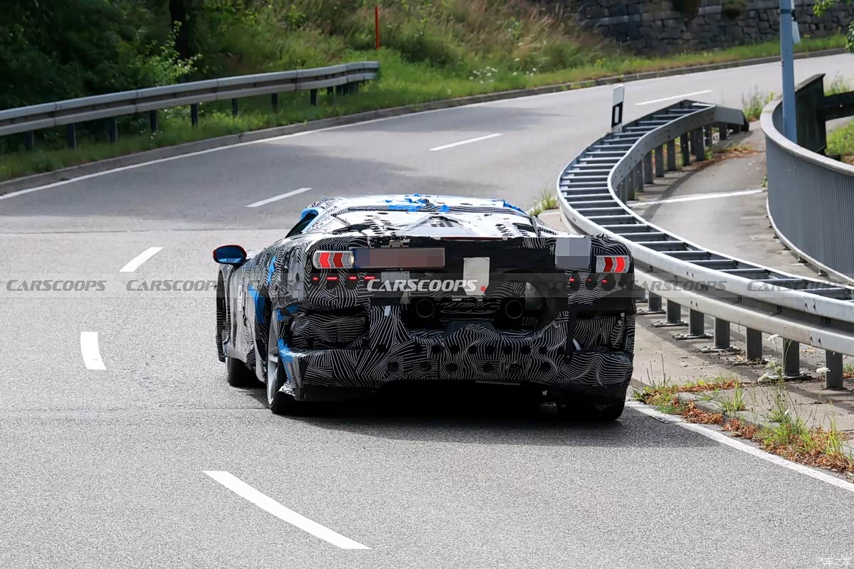 新车侧面依旧是流畅的空气动力学造型,车门处采用镂空的进气口,依旧十分战斗。不过目前车身上有大量伪装材质,还不能看清其细节造型。车尾方面,车辆整体包围造型十分夸张,采用中置双出排气布局,预计也将采用全新尾灯组。