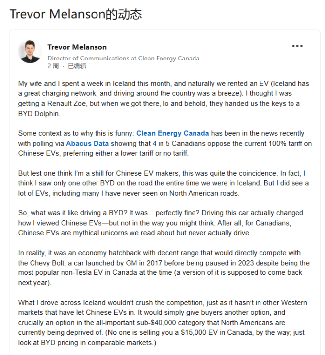 Melanson在环保智库Clean Energy Canada工作,经常研究电动车市场和加拿大的环保政策。他一直倡导降低对中国电动车的关税。尽管他驾驶过各种电动车(包括拥有一辆特斯拉Model 3),但他从未驾驶过比亚迪,因为这种车在美国和加拿大都买不到。
