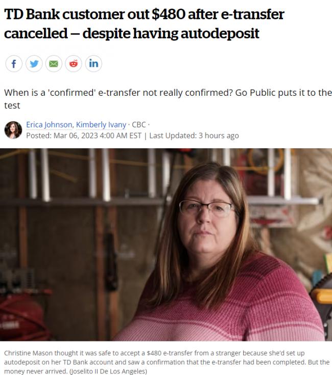 她说,经理说这不是TD银行的问题,该行对电子转账有安全协议。一旦客户点击“发送”到激活了自动存款的账户,他们就不能取消交易。