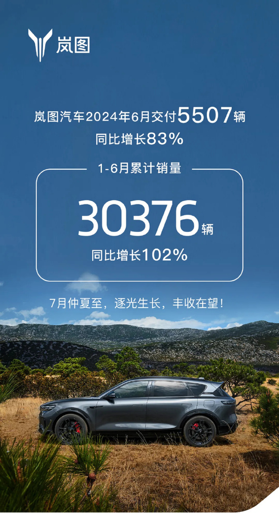 岚图6月交付量同比增83%,1-6月累计交付量30376辆,同比增长102%。