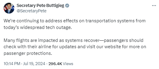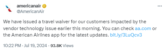 美联航、达美航空和美国航空等航空公司已恢复运营,并发布了旅行豁免以帮助客户重新预订行程。美国运输部的一位高级官员提醒航空公司,要对乘客因中断而造成的长时间延误进行赔偿。运输部表示,这种中断属于航空公司的控制范围内。