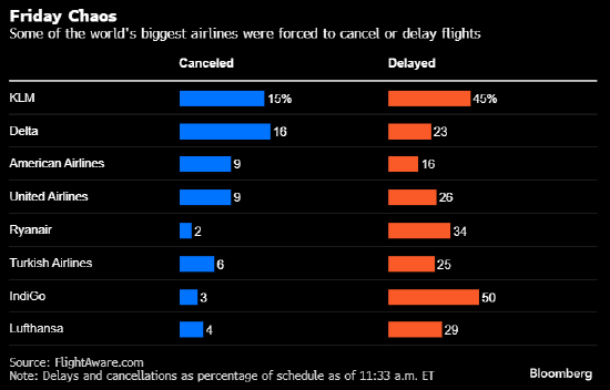 由于一场波及甚广的软件故障,全球各大航空公司周五取消或推迟了数以千计的航班,目前正在慢慢复飞。此次干扰料将持续到周末。