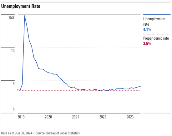 分析师表示,通胀这枚“硬币”的另一面是劳动力市场,过去两年大幅疲软,但仍保持健康。根据美国劳工统计局的数据,职位空缺已从2022年3月的约1200万个减少至今年5月的约800万个。与此同时,失业率从2022年12月的低点3.4%上升至6月的4.1%。