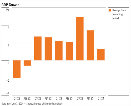 由于消费者支出约占美国经济活动的70%,消费支出增速放缓也成为经济增长放缓的主要驱动力。GDP增速从2023年第三季度的4.9%下降至今年第一季度的1.4%。FactSet的数据显示,尽管经济学家预计第二季度GDP增速将接近2%,但这仍反映出放缓趋势。