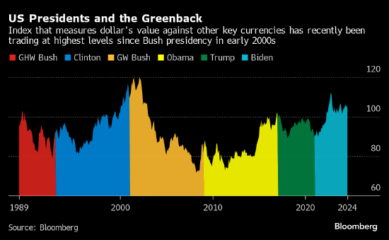 这位共和党候选人以其民粹主义形象彻底改革了该党,还把对强势美元持怀疑态度的俄亥俄联邦参议员詹姆斯·万斯选为竞选搭档,如果特朗普击败哈里斯,他将在第二个任期继续未竞的事业,抗议美元强势,他认为美元走高是导致贸易逆差大幅扩大和行业空心化的罪魁祸首。